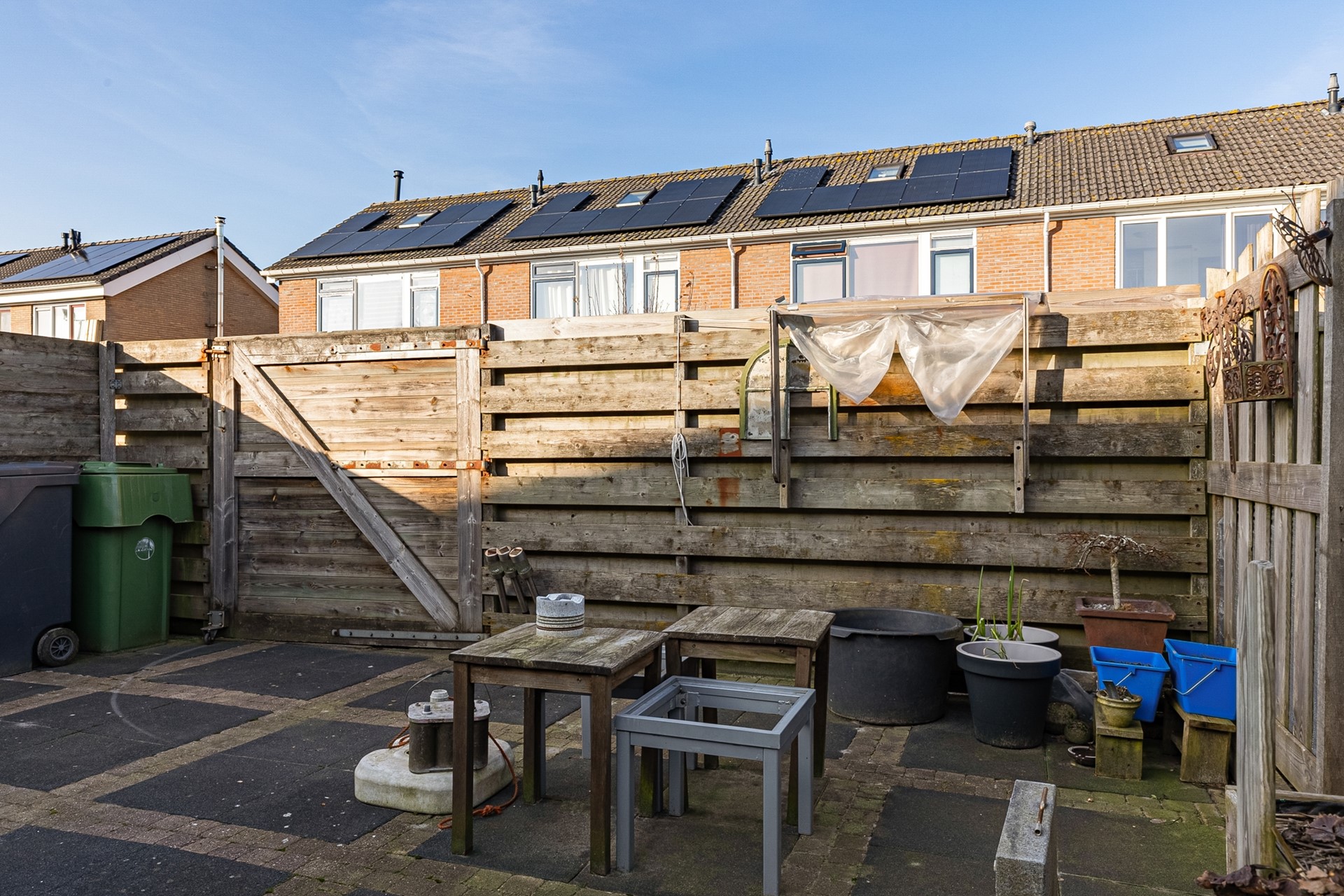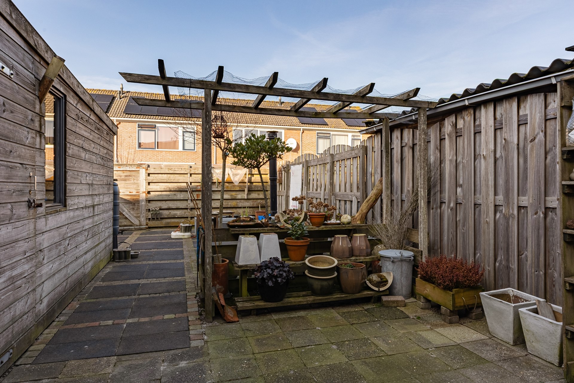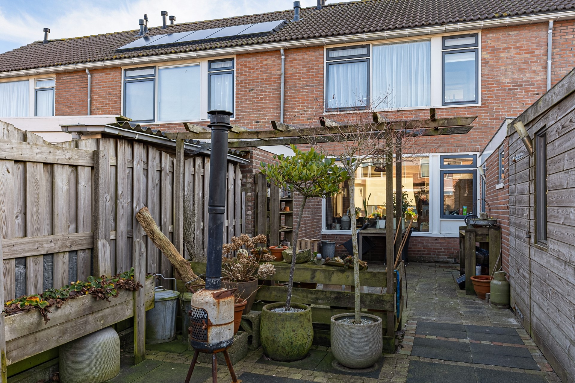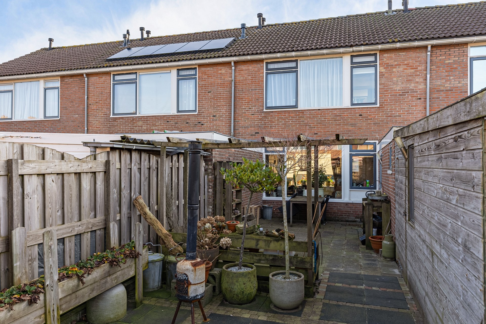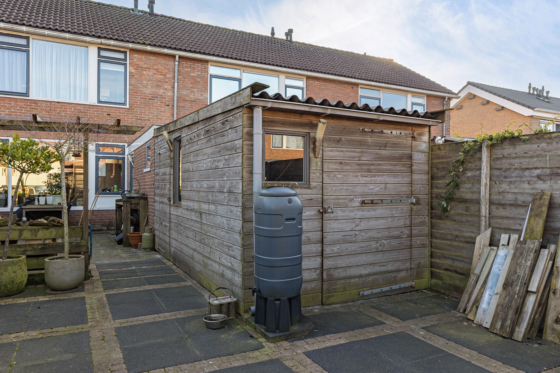 De achtertuin is ruim en beschikt over een aangebouwde berging, ideaal voor fietsen, tuingereedschap en opslag.