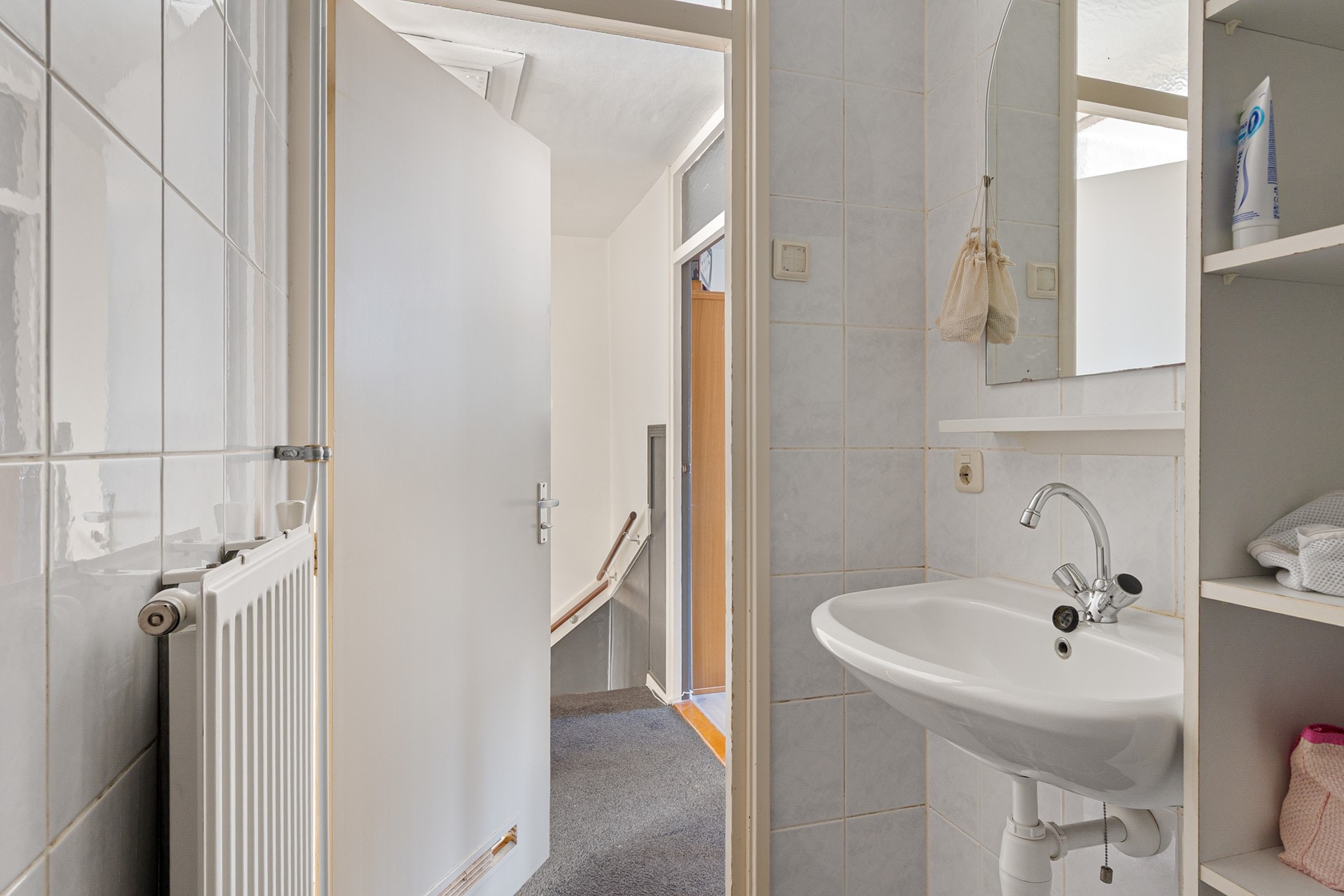De overloop geeft toegang tot vier slaapkamers en de badkamer. De badkamer is voorzien van douche en wastafel.