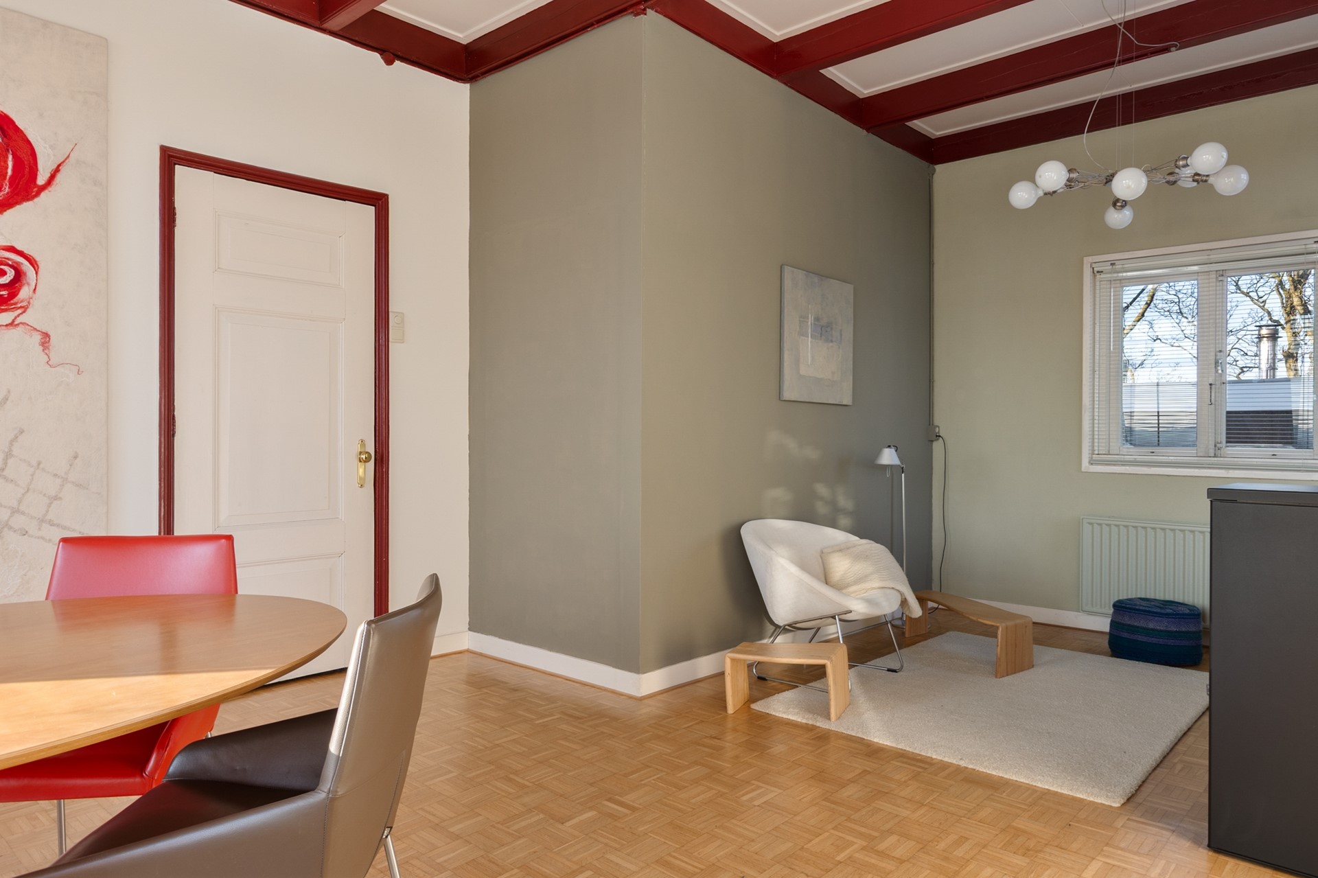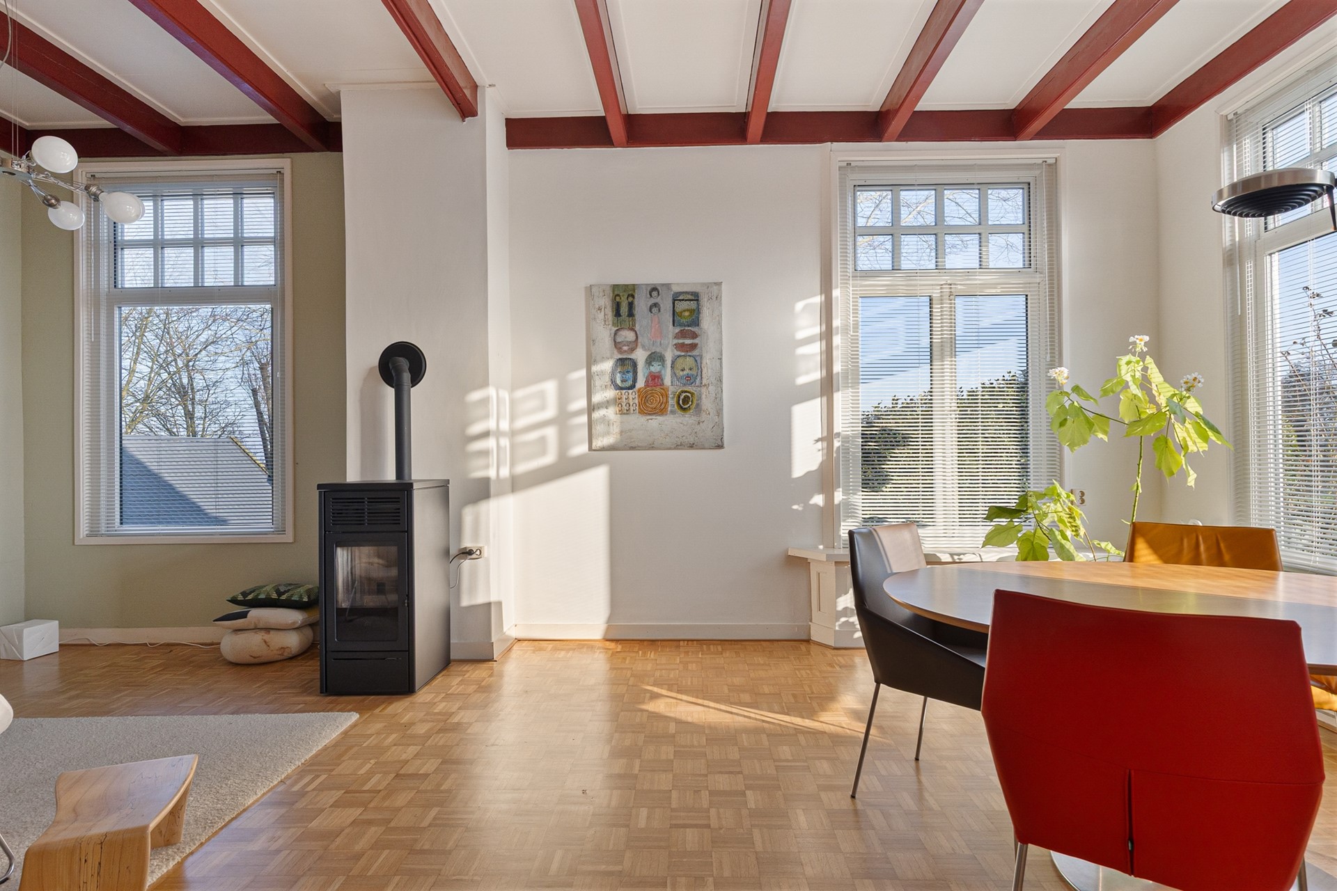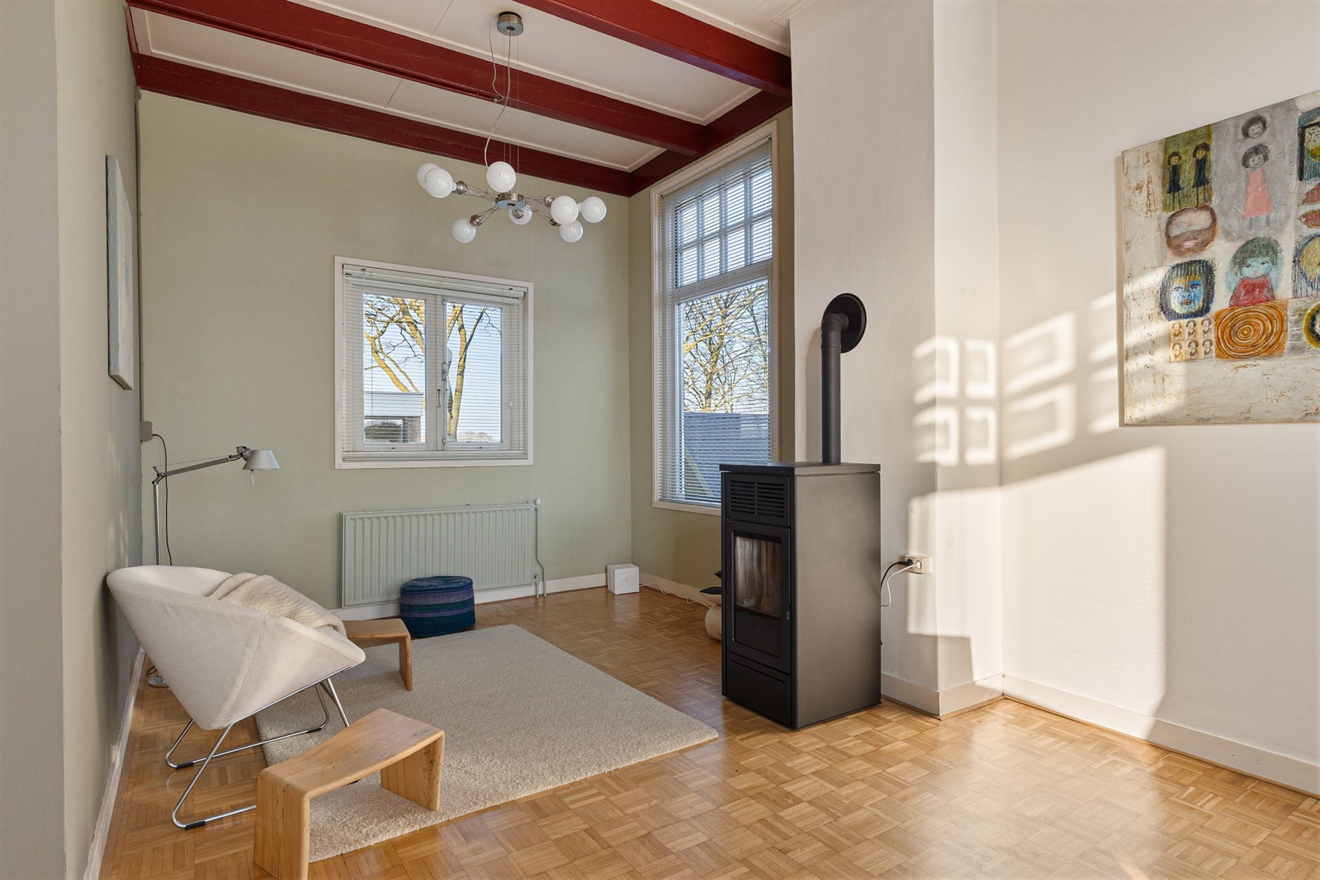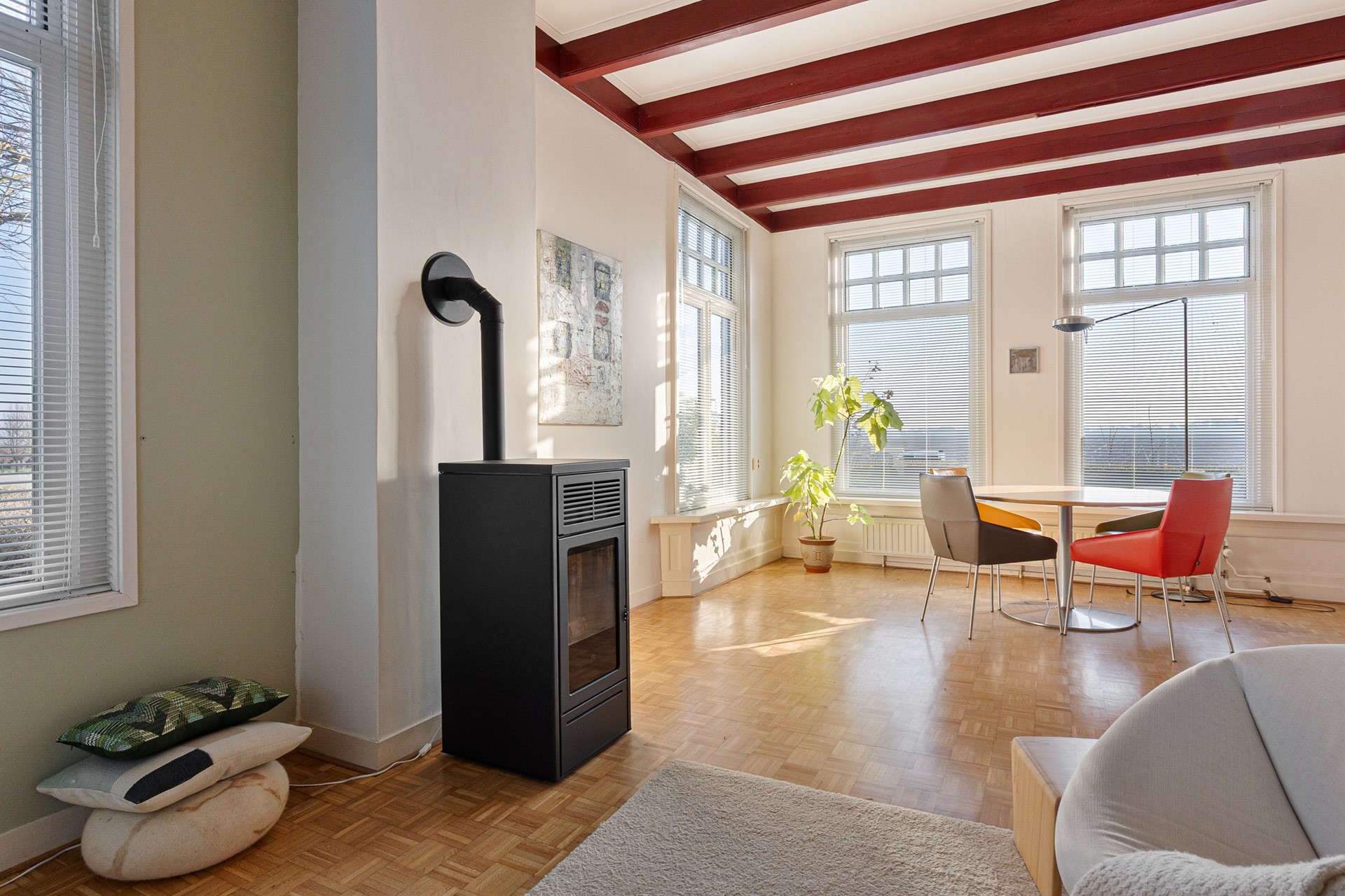 Via de entree kom je in de hal met toilet en trapopgang naar de eerste verdieping en het souterrain. Vanuit de hal bereik je de lichte woonkamer met pelletkachel en grote raampartijen die zorgen voor veel daglicht.