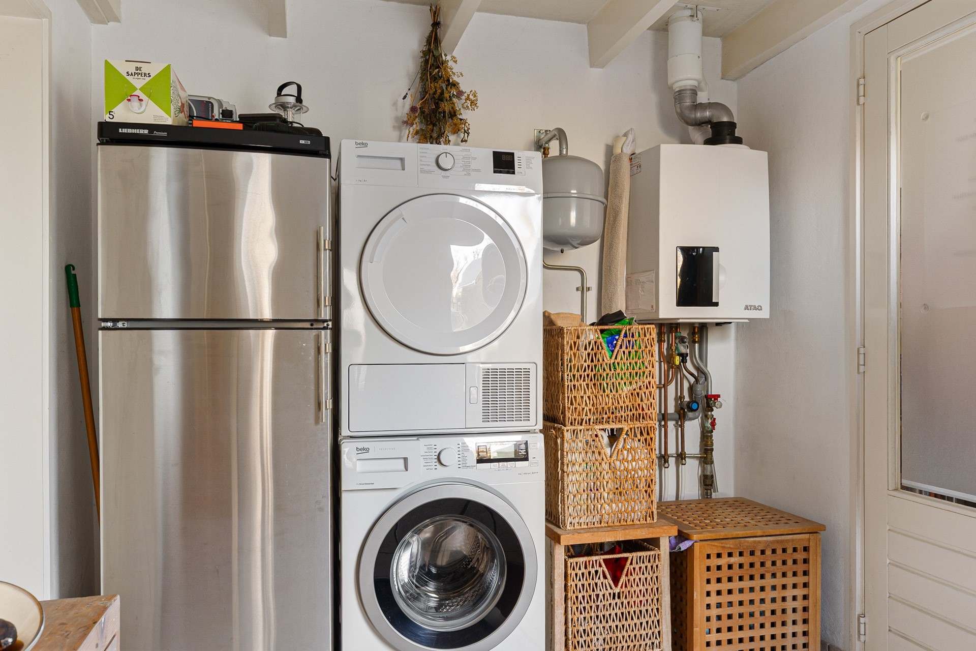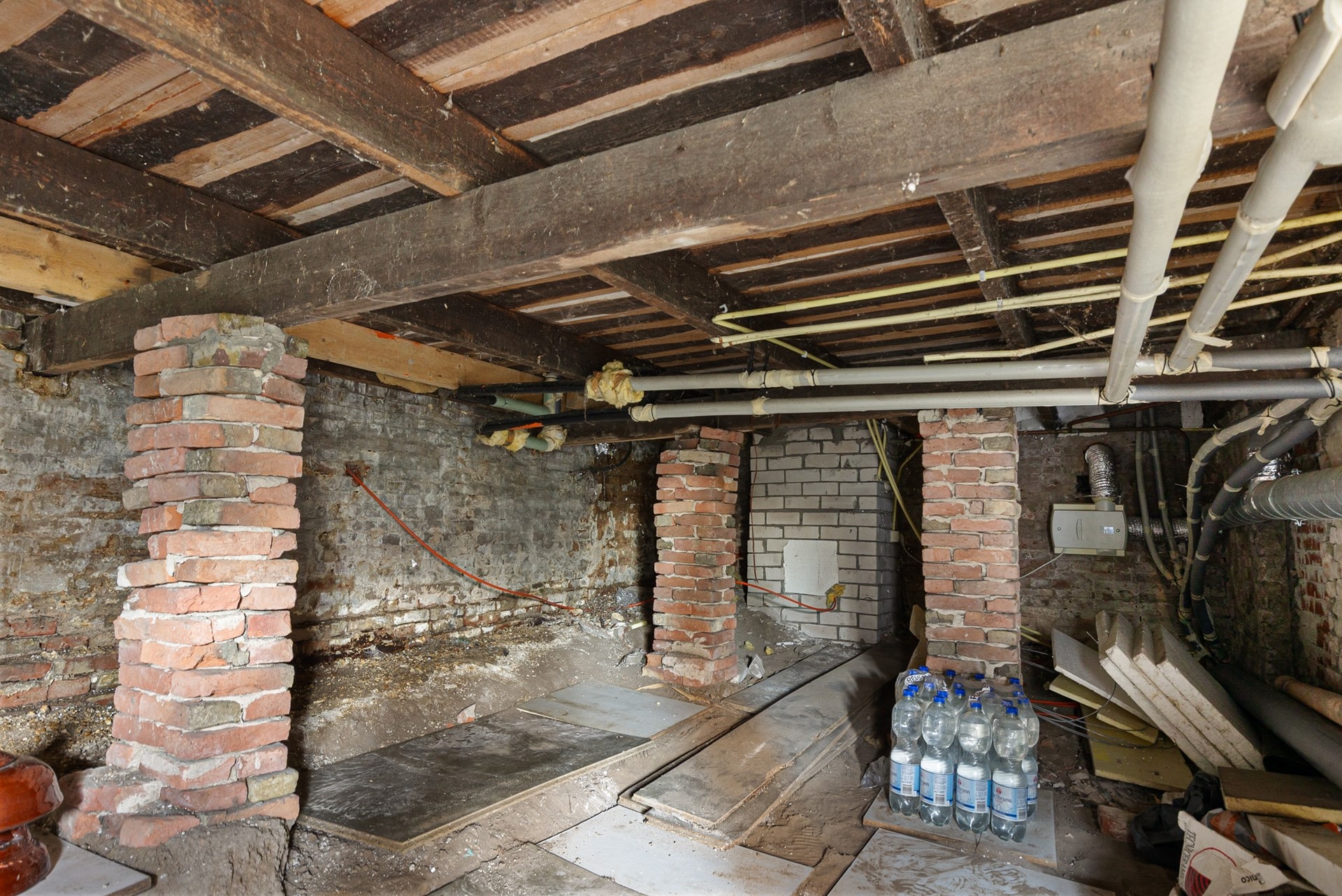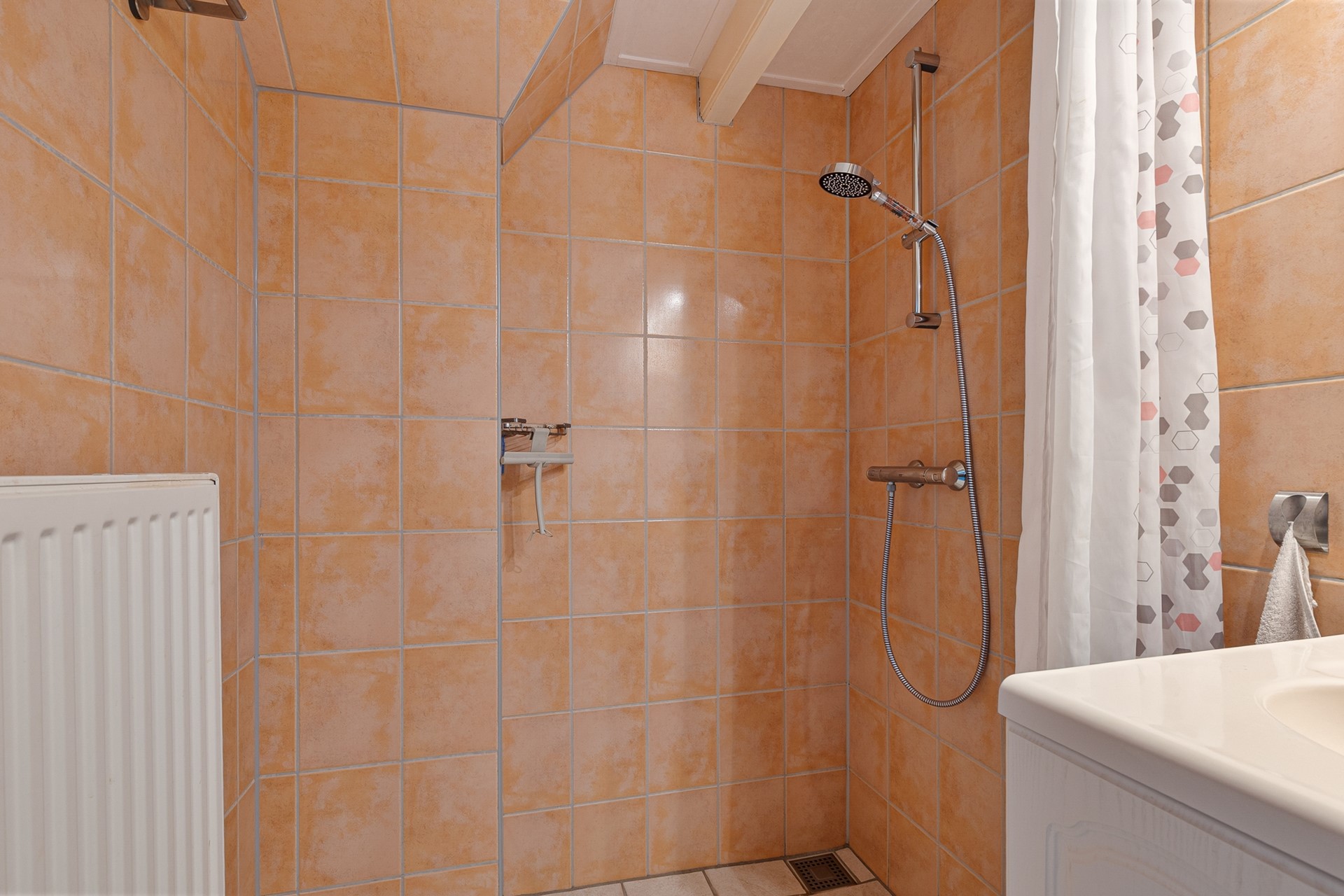 Het souterrain heeft een hal met toegang tot de badkamer, voorzien van douche, toilet en wastafelmeubel. Vanuit de hal bereik je tevens de bijkeuken met opstelling van de C.V.-ketel (Atag, 2015), witgoedaansluiting en een deur naar de tuin.