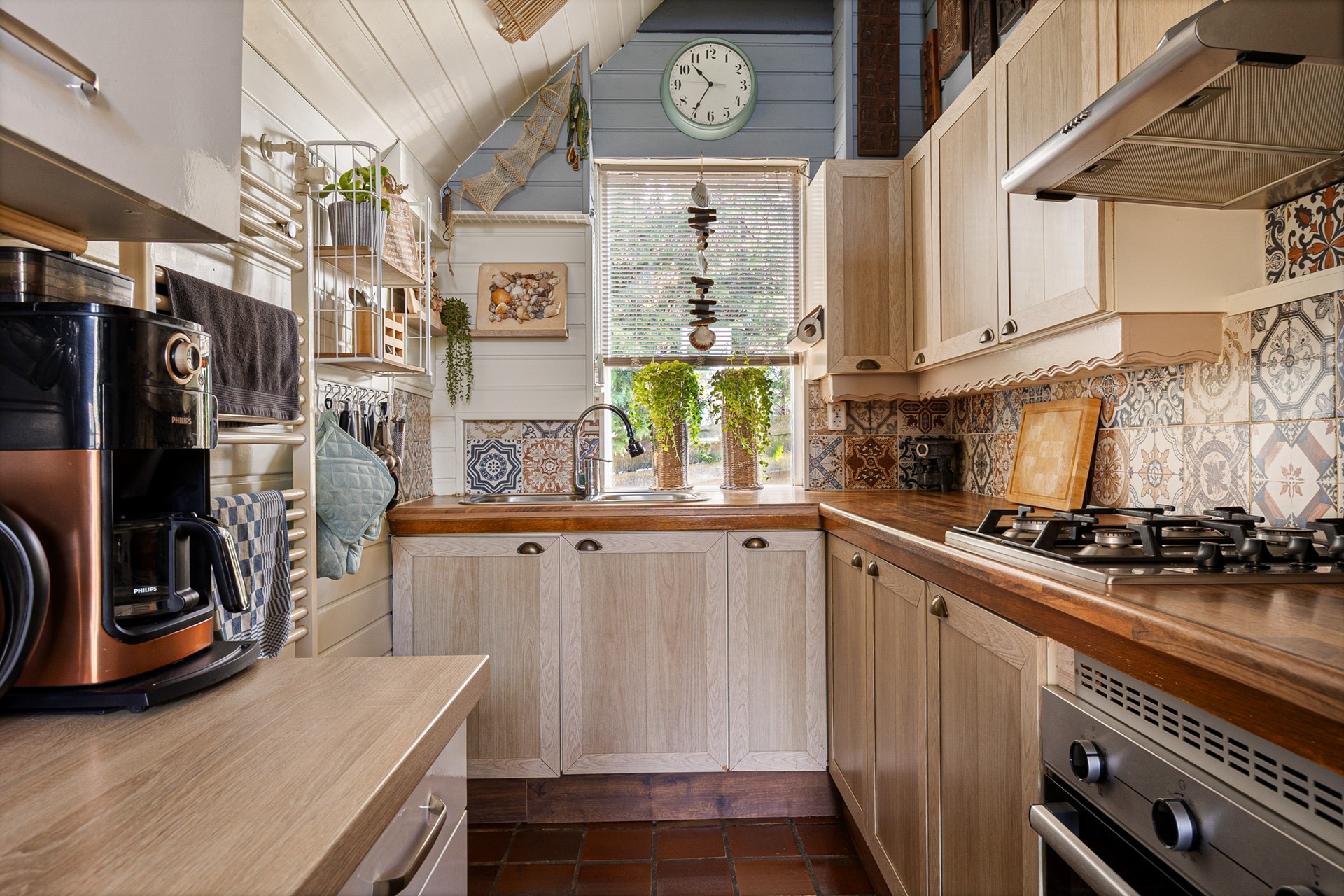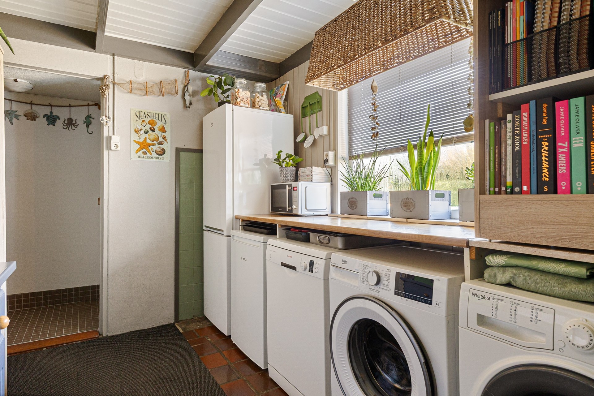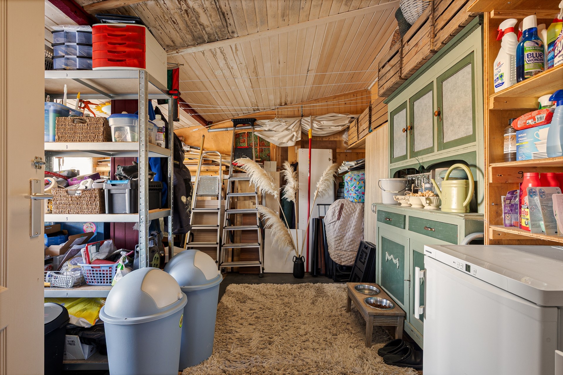 Verder is via de achterste hal de bijkeuken bereikbaar. De bijkeuken beschikt over een wasmachineaansluiting en een luik met losse trap naar een praktische bergzolder. Achter de bijkeuken bevindt zich de berging met opstelling voor de C.V.-ketel (Intergas 2024) en een deur naar de tuin.
