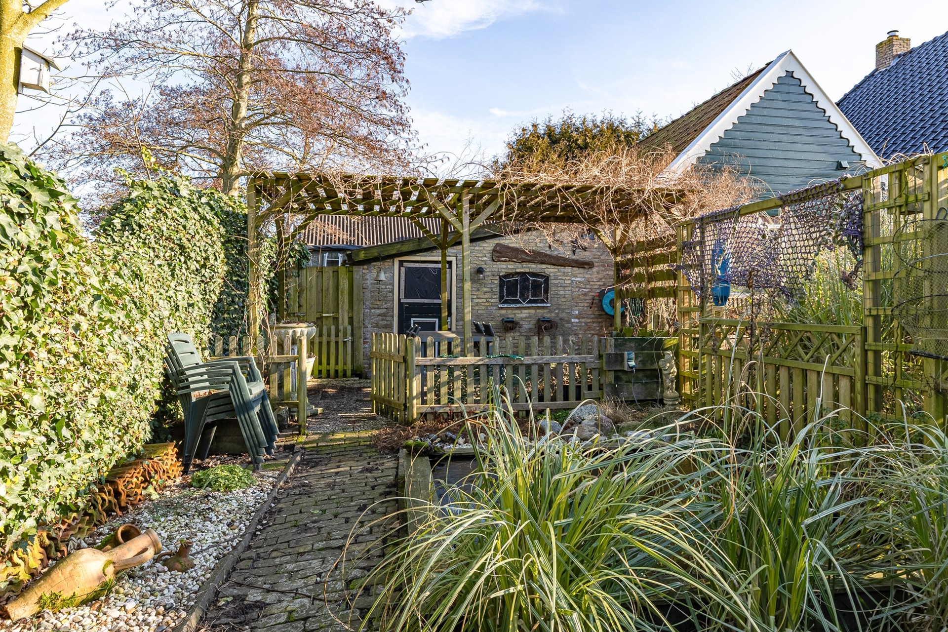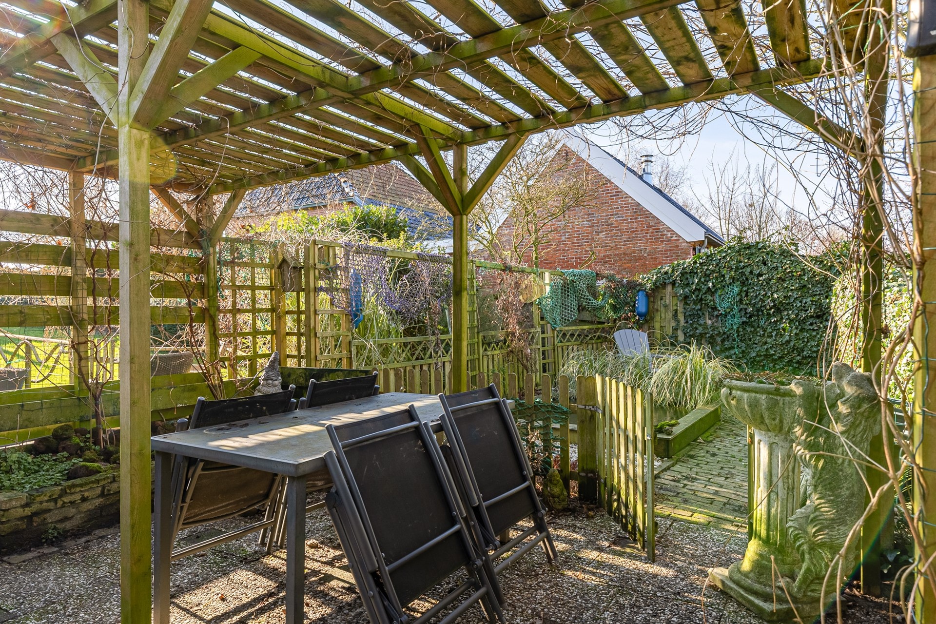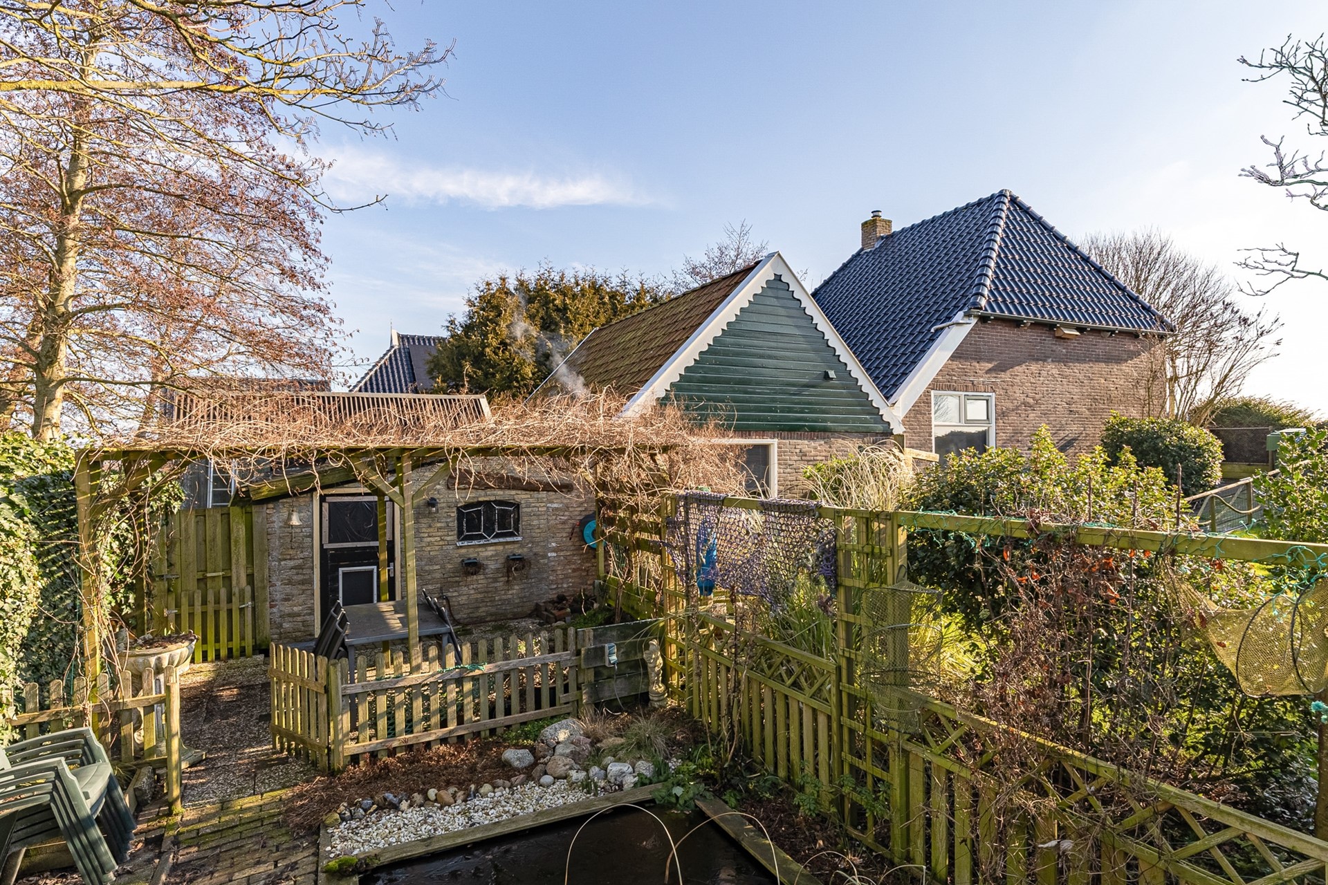 De woning beschikt over een ruime tuin aan de zijkant van de woning met terras, vijverpartij en aangebouwde houten garage. Hier kun je heerlijk buiten zitten en genieten van de rustige, landelijke omgeving.