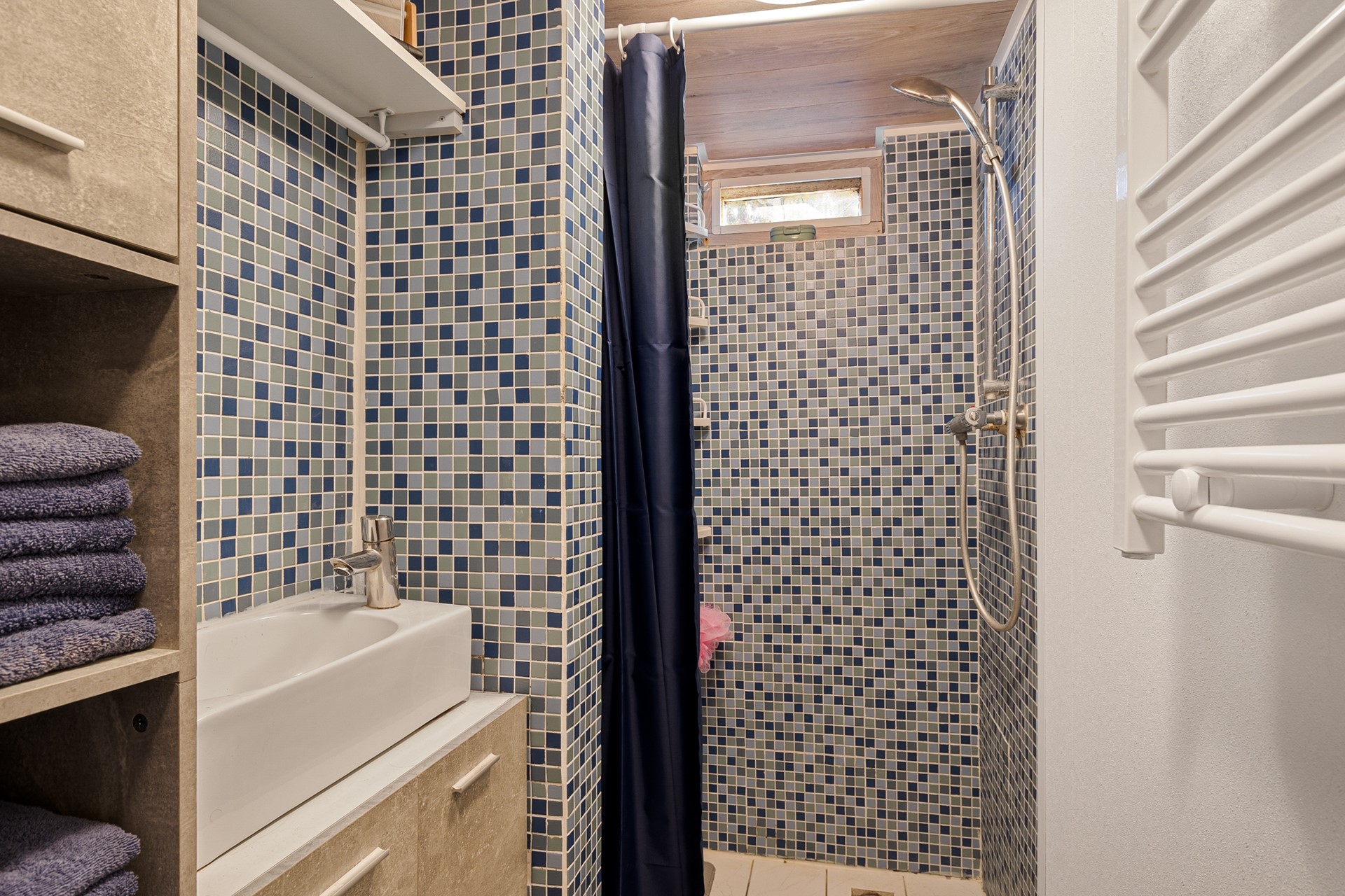 Daarnaast bereik je vanuit de hal de keuken. De keuken biedt ruimte voor een eethoek en is voorzien van diverse inbouwapparatuur. Aansluitend bevindt zich een hal met toiletruimte en toegang tot de badkamer, die voorzien is van een douche en wastafel. Ook bevindt zich hier de slaapkamer met kastruimte.